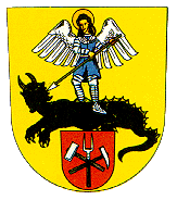 Na zlatém štítě stojí archanděl Michael s bílými křídly, v modrém šatě a ocelové zbroji na knížeti pekel v podobě černého okřídleného ležícího draka s rohatou lidskou hlavou. Vráží mu kopí do hrdla (v pravé části štítu). V patě štítu je červený štítek se zkříženými hornickými kladivy přirozených barev (nebo stříbrná), přes něž jsou svisle, hroty vzhůru postaveny stříbrné rýžovací vidle.